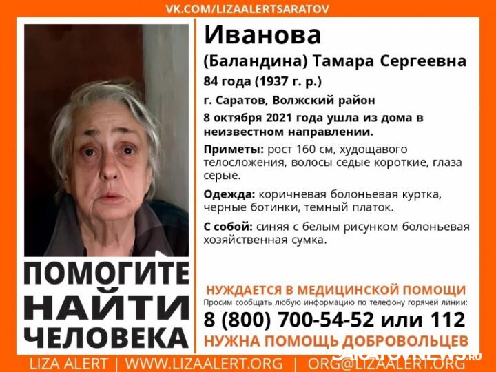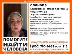 Пропала 84-летняя Тамара Иванова (Баландина), проживающая в Волжском районе Саратова. Ее ищут с 8 октября 2021 года. Пропавшая нуждается в медицинской помощи. Ее рост составляет 160 см, она худощавого телосложения, имеет седые короткие волосы и серые глаза. В день пропажи на ней были коричневая болоньевая куртка, черные ботинки и темный платок. При себе у пропавшей была синяя с белым рисунком болоньевая хозяйственная сумка.
