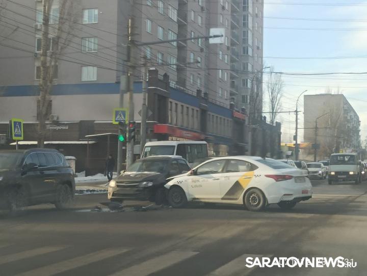 Сегодня, 23 декабря, в Октябрьском районе Саратова произошла дорожная авария с участием такси. На перекрестке улиц Чернышевского и Дегтярной стокнулись автомобили «Лада» и Hyundai Solaris, принадлежащий «Яндекс.Такси».