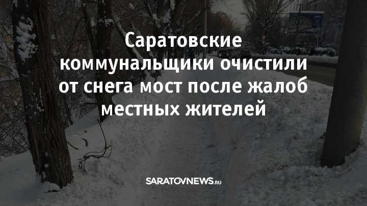В Саратове после жалоб местных жителей МБУ «Дорстрой» провел очистку тротуаров на мосту через железнодорожные пути, расположенном между 1-й Дачной и Студгородком. Об этом сообщает администрация Кировского района.