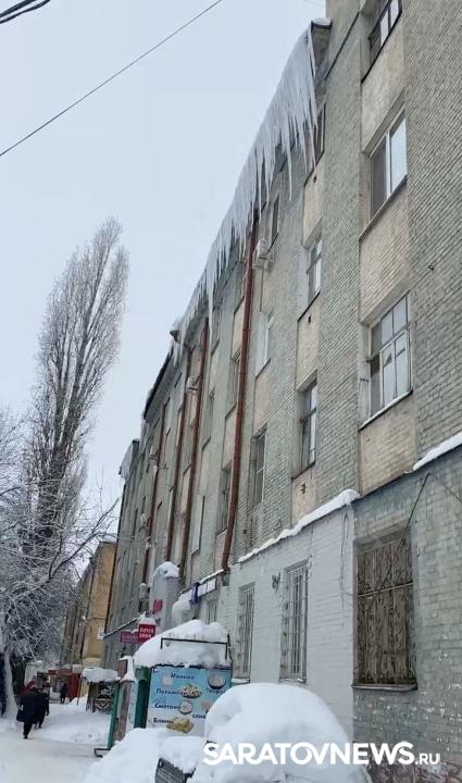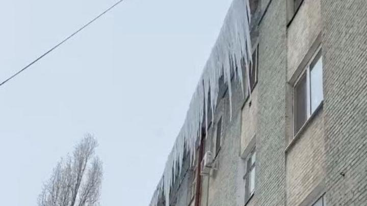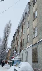 Жители улицы Дома 8 марта, 3 жалуются на ледяные наросты длиной в целый этаж. Опасные сосульки свисают с крыши четырехэтажного дома. Прямо под ними вход в почтовое отделение. Горожане боятся зайти на почту из-за угрозы обрушения наледи. Жильцы говорят, что соседний дом такой же.