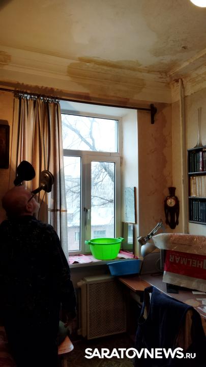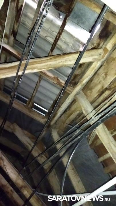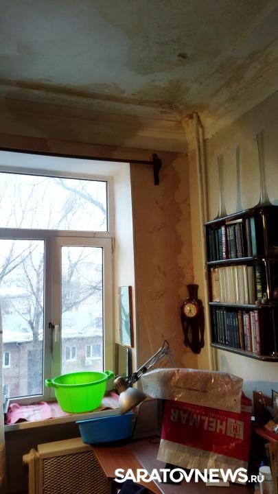 Жители дома №31 по улице Лермонтова в Саратове много лет жалуются на протекающую крышу. Из-за постоянного скопления снега и льда на крыше, с потолков квартир полились ручьи. В результате использования ломов при чистке карнизов от сосулек поверхность крыши стала напоминать решето. Кроме того, усилились течи и по фасаду дома, что привело к падению лепнины. На чердаке граждане вынуждены устанавливать емкости для сбора талой воды, однако они не успевают их опорожнять - вода переливается и течет на потолки.