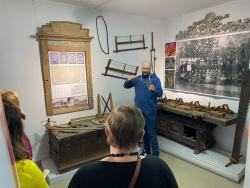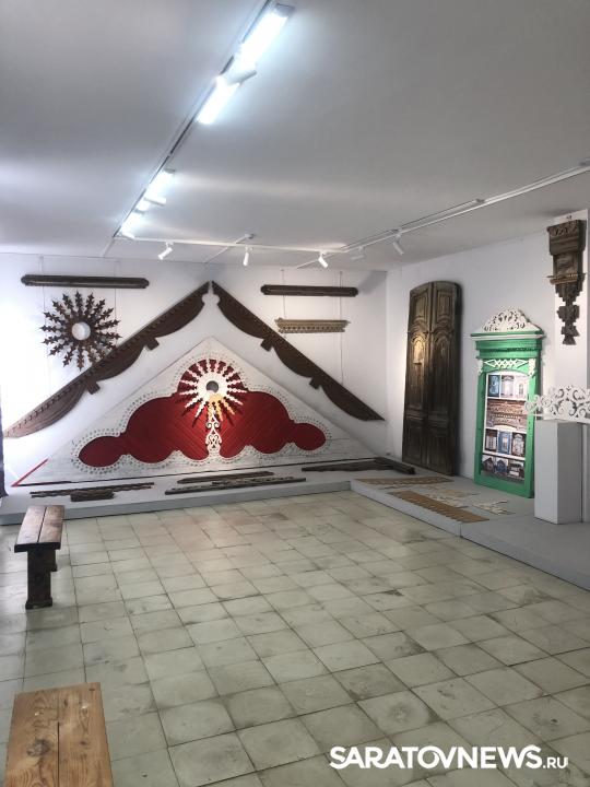 Среди ярких экспонатов – уникальная для наших мест лобная доска с нижегородско-городецким типом глухой резьбы: с розетками, растительным орнаментом и виноградными лозами. Шестиметровую доску нашли в селе Алексеевка Хвалынского района. Также в экспозиции представлен целый фронтон со слуховым окном в виде ярила, полотенцем и причелинами. Его удалось спасти и привести в экспозиционное состояние еще в 2019 году. Еще несколько интересных наличников, в которых отражены основные сюжетная линии хвалынской домовой резьбы. «Первая возникла под влиянием каменной архитектуры и господствующих стилей – классицизма, эклектики и барокко. Это наличники с накладным геометрическим орнаментом, валютами, накладками. Вторая сюжетная линия складывалась под воздействием духовной жизни мастера, отражала его картину мира с различными религиозными символами, мифами и легендами, получила развитие из глубин народного творчества и наиболее ярко и разнообразно отразилась в пропильной резьбе в виде стилизованных драконов, двуглавых орлов, беригинь», – отмечает Алексей Наумов.