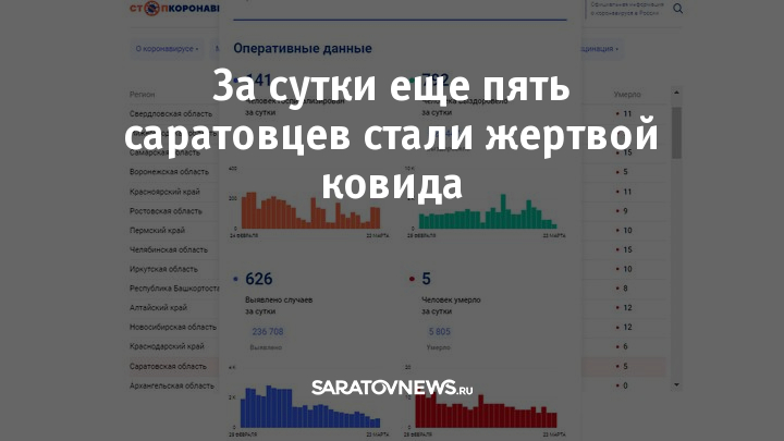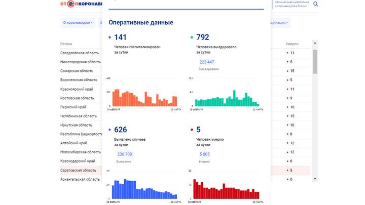 Сегодня, 23 марта, оперштаб РФ сообщил новые данные по смертности от COVID-19 в Саратовской области.