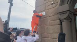 Анидалов запрыгнул на стемянку, на которой рабочий прикручивал табличку, и попытался ее сорвать.