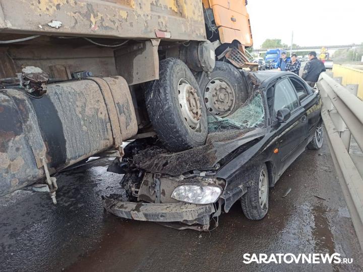 У Клещевки автомобиль Кiа Spectra влетел под грузовик Shaсman. Легковушка оказалась буквально раздавлена самосвалом.