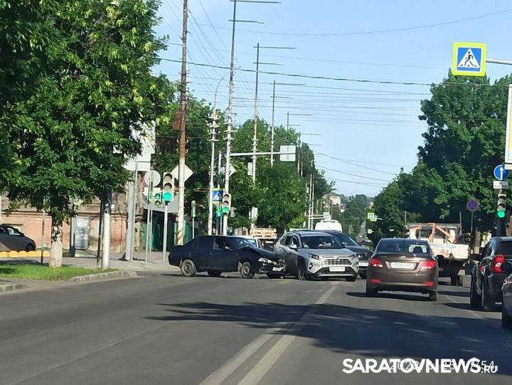 Несколько минут назад в Саратове на перекрестке улиц Соколовой и Рахова столкнулись "Тойота" и "ВАЗ-2115". Машины перекрыли полосу движения в сторону улицы Астраханской. Образовалась пробка.