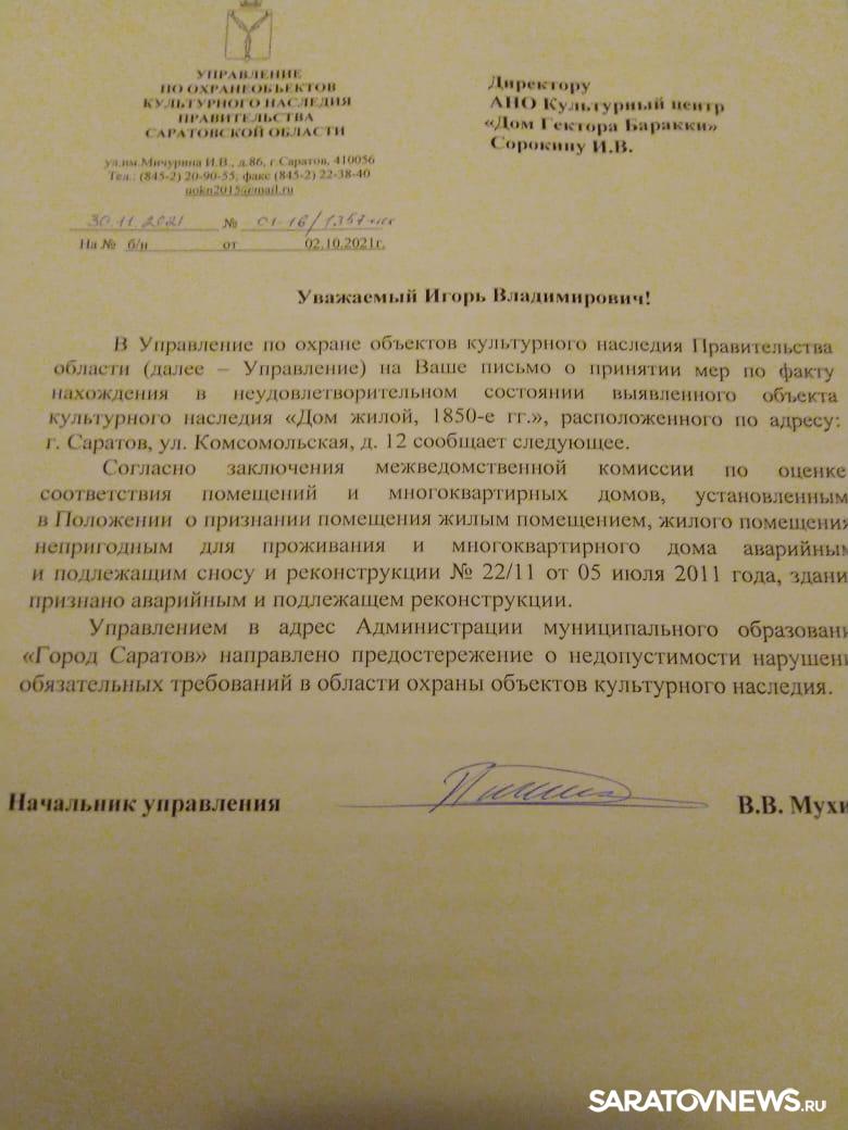 Кроме того, 2 ноября 2021 года директор Культурного центра "Дом Гектора Баракки" Игорь Сорокин обращался к министру - начальнику Управления по охране памятников Владимиру Мухину с просьбой принять меры для сохранения этого ценного исторического здания.