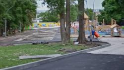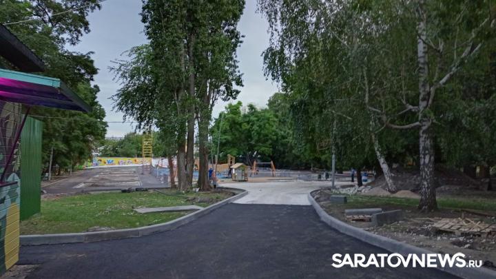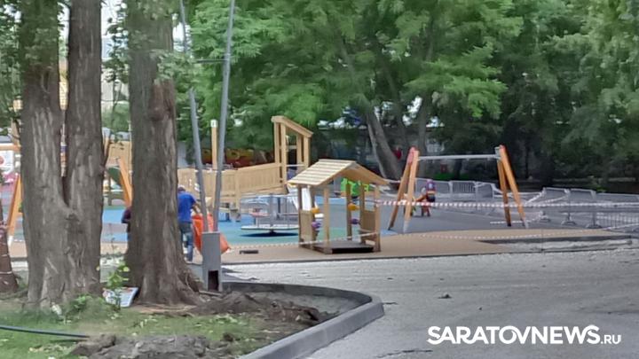 В городском парке Саратова идет благоустройство детской площадки. Она расположена слева от входа в парк со стороны улицы Рахова. Уже обновлен асфальт и бордюры на дорожках, ведущих к игровой зоне. На площадке демонтированы старые элементы. Вместо них появился новый деревянный городок с лестницами, домами, переходами, качелями.