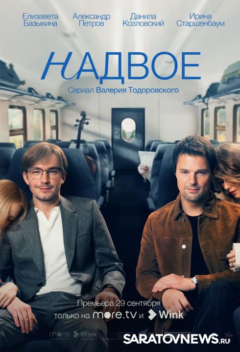 Выходит трейлер 9-серийной мелодрамы режиссера Валерия Тодоровского «Надвое» (16+) с Данилой Козловским и Александром Петровым, которые впервые снялись вместе и исполнили главные роли. Это совместный проект видеосервисов Wink, more.tv и телеканала «Россия». Цифровая премьера сериала состоится 29 сентября 2022 года, а после его покажут по телевидению. Картина пополнит линейку Wink Originals и more originals.