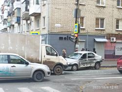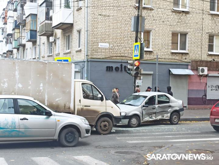 Несколько минут назад в Саратове на перекрестке улиц Мичурина и Григорьева столкнулись грузовая "Газель" с "Рено Логан" под управлением водителя-инвалида. В результате аварии грузовик помял левую сторону иномарки.