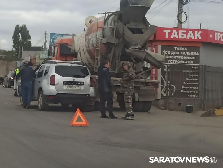 Несколько минут назад в Саратове на Вольском тракте столкнулись бетономешалка и "Reno Duster". По этой причине на автомагистрали образовалась пробка.