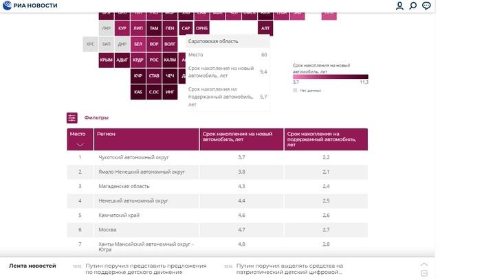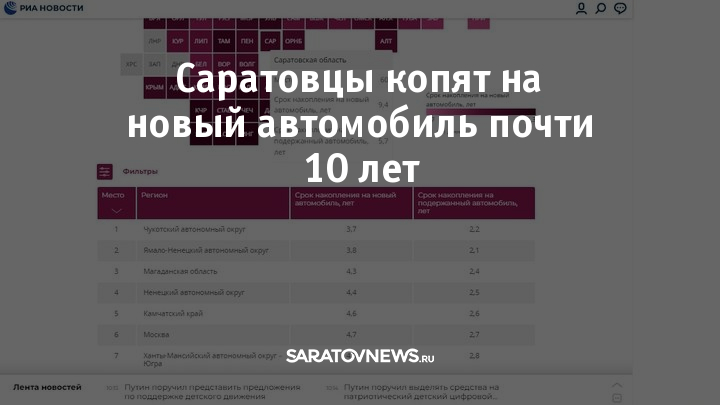 Саратовская область попала на 60 место из 89 в рейтинге регионов по способности населения накопить на автомобиль. На новый автомобиль саратовцы копят в среднем 9,4 года, на подержанный автомобиль - 5,7 года.