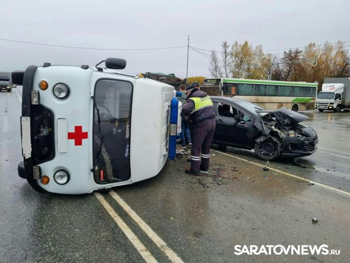 Примерно два часа назад в Гагаринском районе Саратова произошло ДТП. У поворота на поселок Красный Октябрь (на трассе "Саратов - Сызрань - Волгоград") столкнулись автомобиль скорой помощи "УАЗ" и Peugeot. В результате удара "буханка" перевернулась.