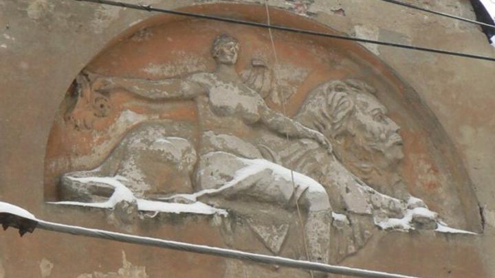 Двухэтажный дом на ул. Челюскинцев, 75 признан аварийным. Литеру «А» будут реконструировать, а литеры «В» и «Г» демонтируют до 1 апреля 2024 года. Этот дом известен скульптурным украшением - львом с человеческим лицом.
