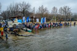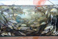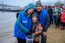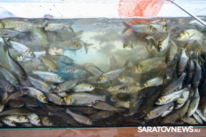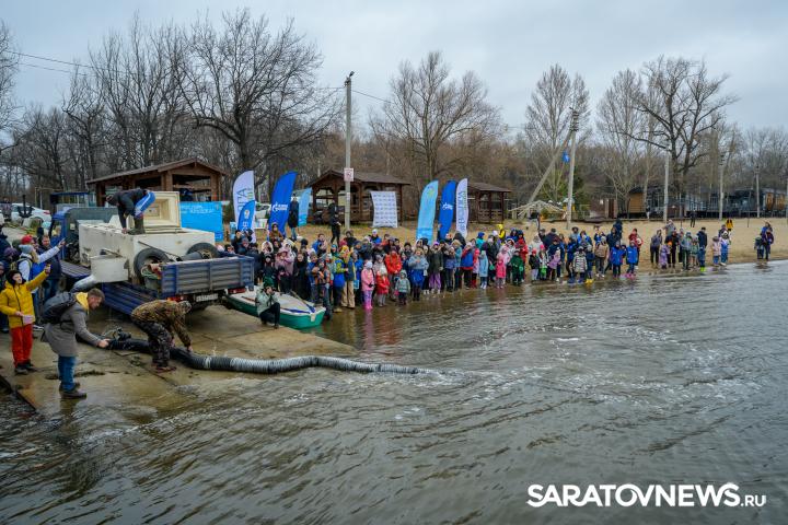 Гости мероприятия получили от организаторов ковшики и ведерки, при помощи которых зачерпывали мальков из большого аквариума и выпускали в реку, после чего основную массу рыб в водоем отправил специальный автомобиль.