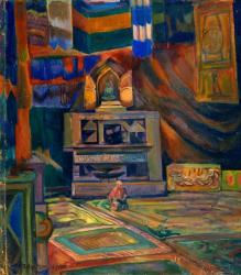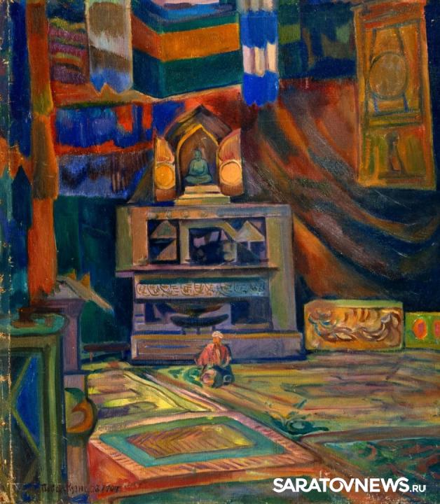 У Павла Кузнецова есть загадочная работа «Пагода». Картина подписана 1907 годом, в каталоге датируется 1913 годом, и обе даты, как и обстоятельства ее написания, вызывают сомнения. Известно, что в 1911-1912 художник путешествовал по Заволжским степям, а в 1912-1913 ездил в Среднюю Азию. На картине – внутреннее помещение буддийского храма, перед алтарем – сидящая фигура. Допустим, картина написана с натуры, но где? В Средней Азии в то время не могло быть буддийских сооружений, значит увидеть статую Будды Кузнецов мог только на территории Калмыкии, но никаких свидетельств такой поездки нет.