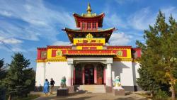 Цель нашего паломничества называлась совсем прозаично: село Речное. Совсем обычное, одноэтажное, с деревянными и саманными домиками. Кошки, собачки, шампиньоны на коровьих лепешках. И в конце центральной улицы – Ленина, разумеется – стоит огромный, по сравнению с окружающими строениями, желто-белый храм. Классические вертикали венчают изогнутые крыши – европейская и азиатская архитектура одновременно. Автора звали роскошно: Батур-Убуши Тюмень. Тюмень – это фамилия.