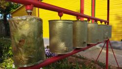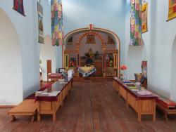 Внутри хурула все очень аскетично. А что там могло сохраниться, если годами использовать храм под зернохранилище? Говорят, оставались фрагменты росписи, но сегодня нет ничего, даже разговоров о ее восстановлении. И фотографии не сохранились. В хуруле беленые стены, простые деревянные лавки, обычный деревянный шкаф и блестящий, золотой, конфеточный алтарь производят странное впечатление. Всё – Ему, а нам здесь ничего не нужно, спасибо, что мы есть. Примерно так, мне кажется, формулируется отношение буддистов-калмыков к этому храму. Потому что сегодня росписей нет, но ведь вчера они были? А если были вчера, то могут появиться и завтра. И суетиться ради этого вечно ускользающего сегодня не имеет никакого смысла.