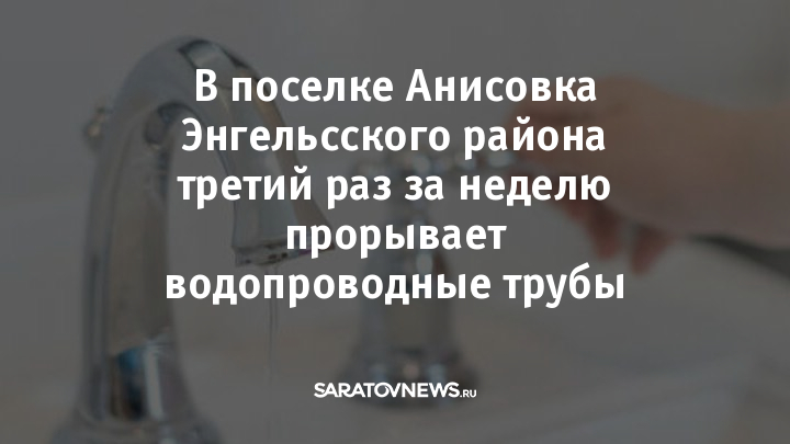В поселке Анисовка Энгельсского района третий раз за неделю происходят коммунальные аварии. Сегодя водопровод прорвало у дома №153 по улице Суворова. В связи с этим до 15.00 в поселке отключли воду.