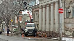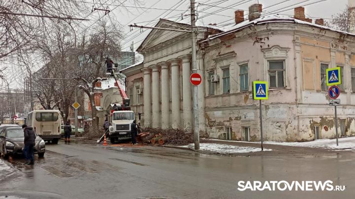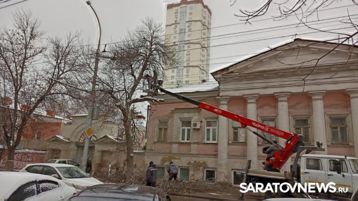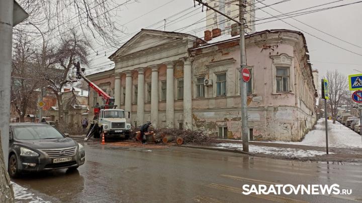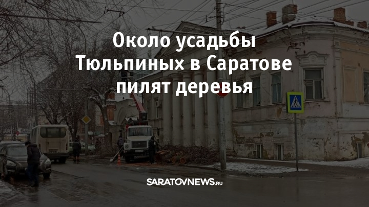 В эти минуты в Саратове перед усадьбой Тюльпиных пилят деревья. К зданию, расположенному на пересечении улиц Первомайская, 23 и Чернышевского, 209, подогнали автовышку. Стволы и крупные ветки уже распилили на части. Об этом сообщили очевидцы.