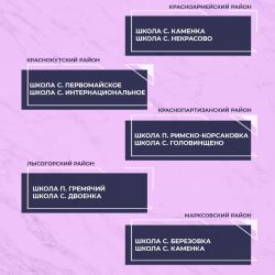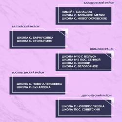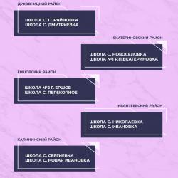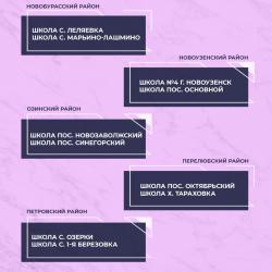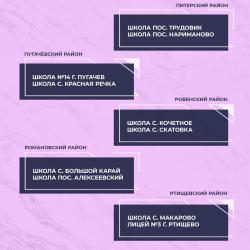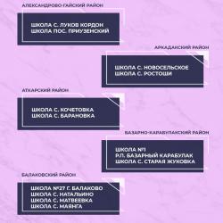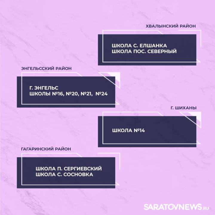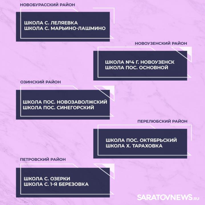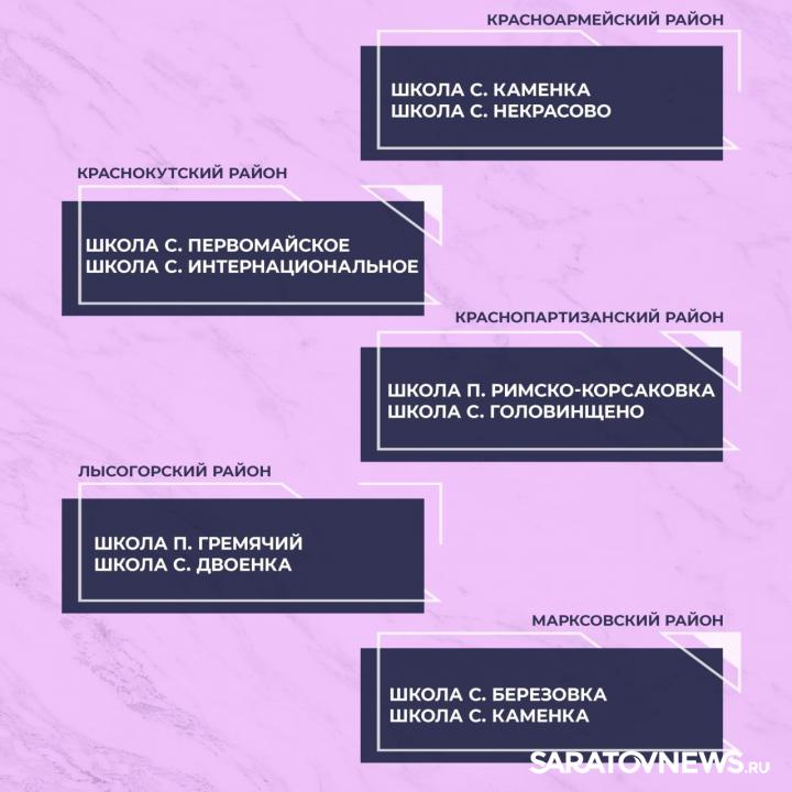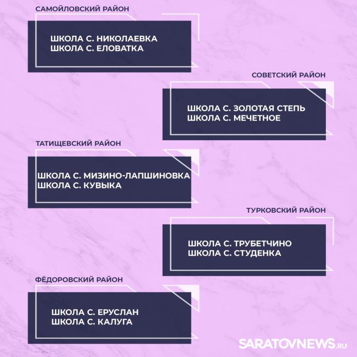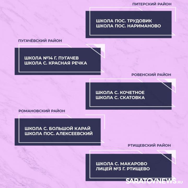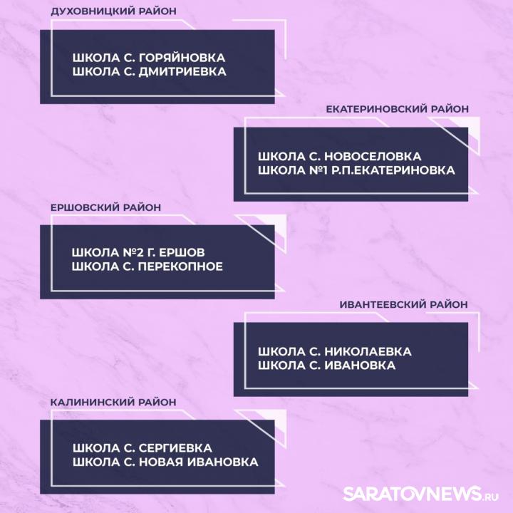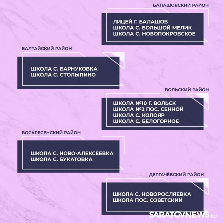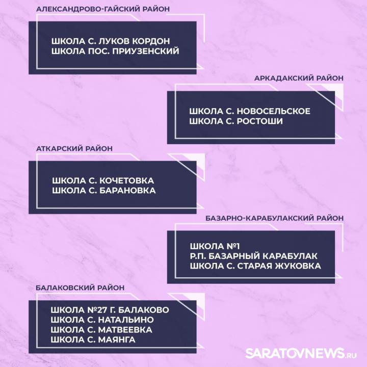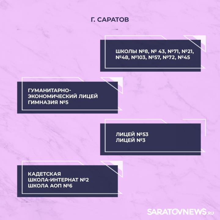 Так, в Саратове в список вошли школы № 8, 43, 45, 71, 72,21, 48, 103, 57, гуманитарно-экономический лицей, гимназия № 5, лицеи № 3 и № 53 и, кадетская школа-интернат № 2, школа АОП № 6, школы поселков Сергиевский и Сосновка.