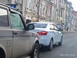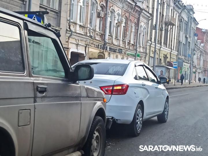 В эти минуты в центре Саратова образовалась пробка. На улице Московской, между улицами Вольской и Горького, столкнулись автомобили "Нива" и "Лада Веста". Машины заняли левую полосу дороги.