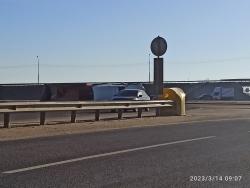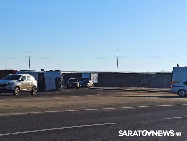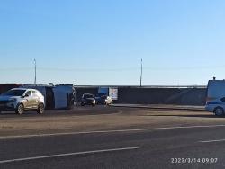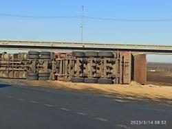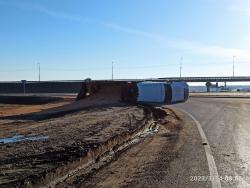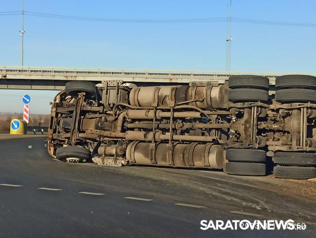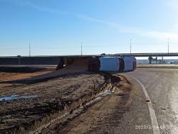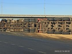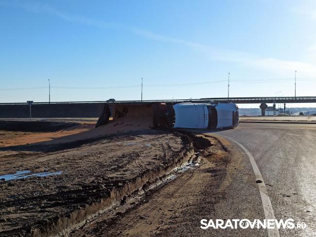 Сегодня утром, 14 марта, на выезде из Саратова произошло ДТП. На Вольском тракте, у кольцевой развязки, перевернулась фура, которая, скорее всего, везла песок. В результате дорожного маневра грузовой автомобиль лежит на боку на обочине, рядом рассыпана куча песка.
