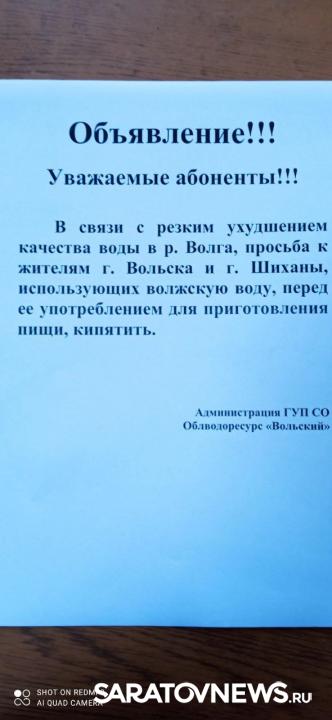 Администрация ГУП СО Облводоресурс предложила жителям городов Вольска и Шиханы "решение" проблемы некачественной питьевой воды. Фото данного объявления разместил один из жителей города Вольска в социальной сети "ВКонтакте". Вместо устранения неполадок в водоочистной системе, администрация посоветовала жителям просто кипятить воду перед употреблением.
