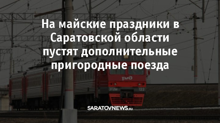 На предстоящие майские праздники в Саратовской области назначены дополнительные пригородные поезда: Примыкание – Аткарск (и обратно), Примыкание – Сухой Карабулак (и обратно), Саратов-1 – Тарханы, Татищево – Примыкание и Тарханы – Анисовка.