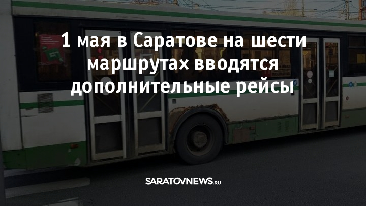 С 1 мая в Саратове вводятся дополнительные рейсы на шести автобусных маршрутах. Как сообщает региональный минтранс, это маршруты: № 226 К «Саратов (Стадион Волга) - Красный Текстильщик», № 283 «Саратов (Стадион Волга) - Синенькие», № 285 «Саратов (Стадион Волга) - 15 Лет Октября», № 291-А «Саратов (Стадион Волга) - Сбродовка (ч/з Константиновку)», № 350 «Саратов (ЦКР) - с. Юрловка» и № 419-А «Саратов (Стадион Волга) - Юрловка (ч/з Сосновку)».