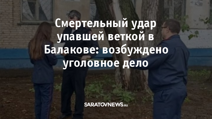 Региональный следственный комитет возбудил уголовное дело по статье УК РФ «Оказание услуг, не отвечающих требованиям безопасности жизни или здоровья потребителей». Напомним, 12 мая в Балакове на 61-летнюю женщину, шедшую по тротуару, упала ветка дерева. Пострадавшую госпитализировали. Некоторое время спустя она умерла в больнице.