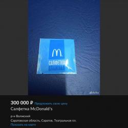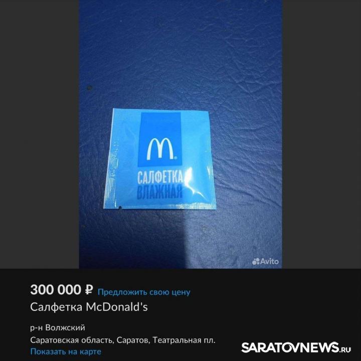 На площадке с бесплатными объявлениями была выставлена на продажу влажная салфетка из ресторана быстрого питания McDonald's, ушедшего из России.