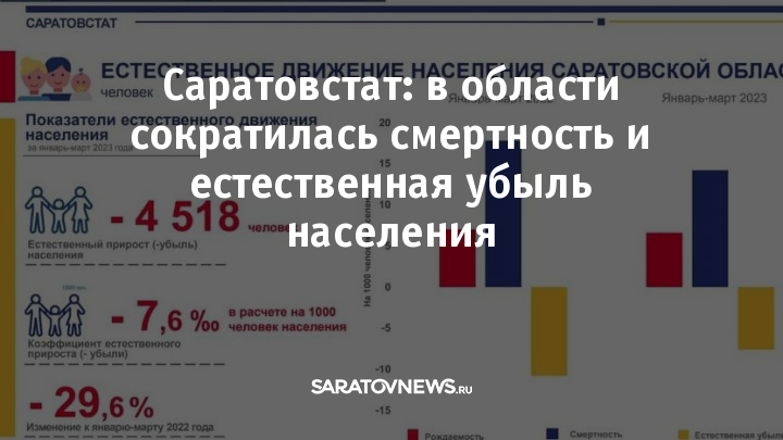 Сегодня, 23 мая, Саратовстат опубликовал данные по естественному движению населения Саратовской области. По оперативным данным за январь-март 2023 года, в области смертность сократилась на 20,2% и составила 14,2 человека на 1000 жителей области или 8432 человека.