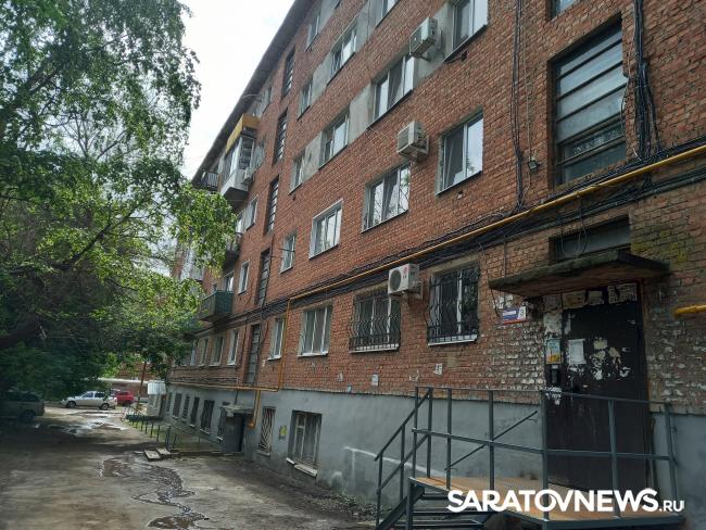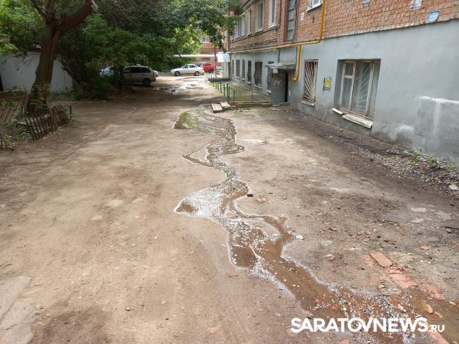 Во дворе дома 22 по улице Горького в Энгельсе протек канализационный колодец. Вода сочится из люка у 3 подъезда и заливает двор.
