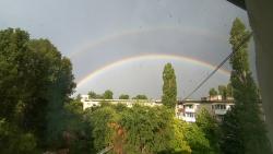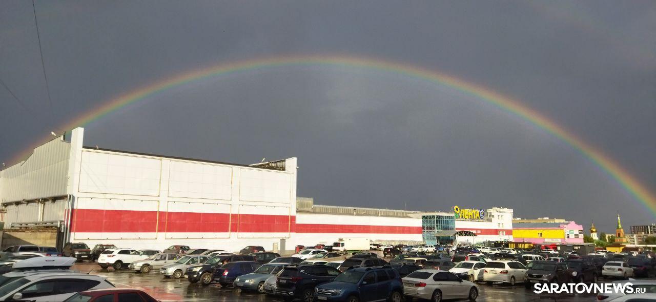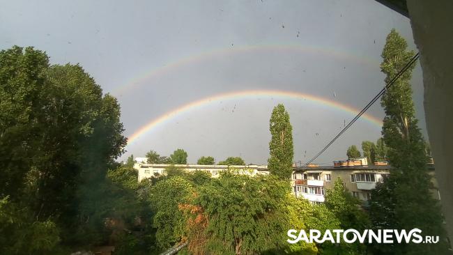 После сегодняшнего ливня вечером в Саратове выглянуло солнце. Затем дождь продолжился, и на небе появилась сначала бледная и размытая радуга. Краски очень быстро проступали, и вскоре радуга стала яркой. Довольно быстро над одной дугой возникла другая.