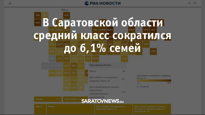 Саратовская область заняла 54 место из 85 в рейтинге регионов по численности среднего класса. Доля семей, относящихся к среднему классу в регионе, составляет 6,1%. Это 1% от общероссийского числа, что следует из исследований, проведенных специалистами РИА Новости.
