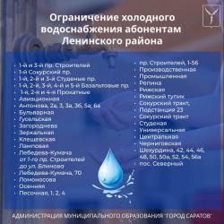Некоторым жителям Ленинского района прекратится подача холодного водоснабжения. Список абонентов можно посмотреть в карточке ниже. По заявкам районной администрации будут подвозить воду.