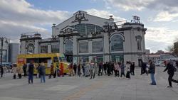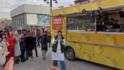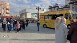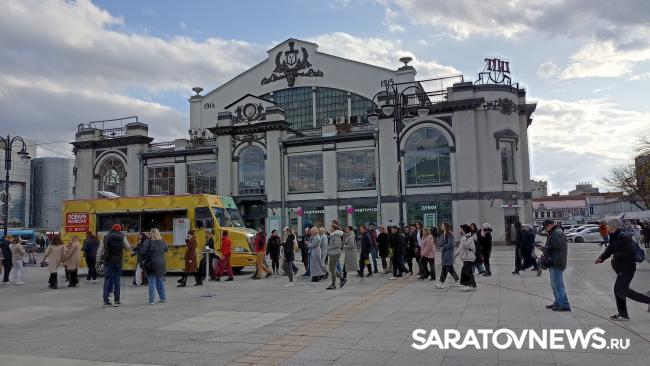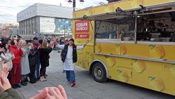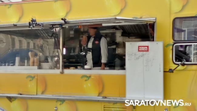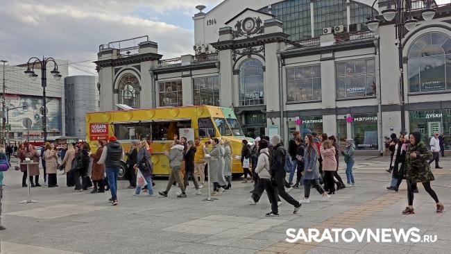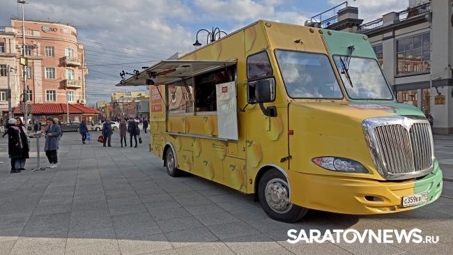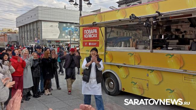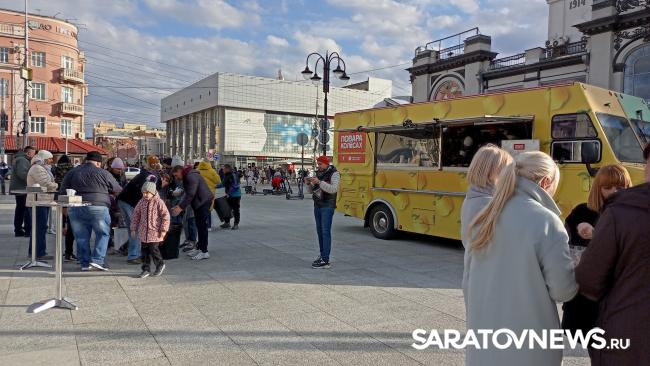 На площади Кирова в Саратове сегодня, 19 октября, проходили съемки кулинарного шоу "Повара на колесах". Около ярко-желтого фудтрака собрались прохожие, желающие поучаствовать в проекте.