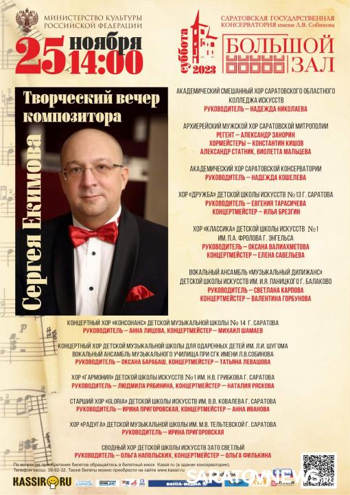В прошедшую субботу в Саратовской консерватории прошел творческий вечер с одним из самых известных композиторов Санкт-Петербурга, членом Союза композиторов России, художественным руководителем Хора петербургской Консерватории, художественным директором Международного фестиваля хорового искусства «Поющий мир» Сергеем Екимовым.