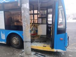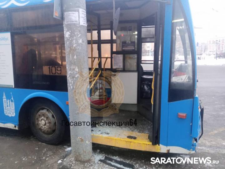 Утром на Привокзальной пощади в Саратове произошло ЧП. У остановки общественного транспорта троллейбус № 109 (Ж/д вокзал - ЗАО "Тролза") врезался в столб. В результате удара оказалась разбита передняя пассажирская дверь.
