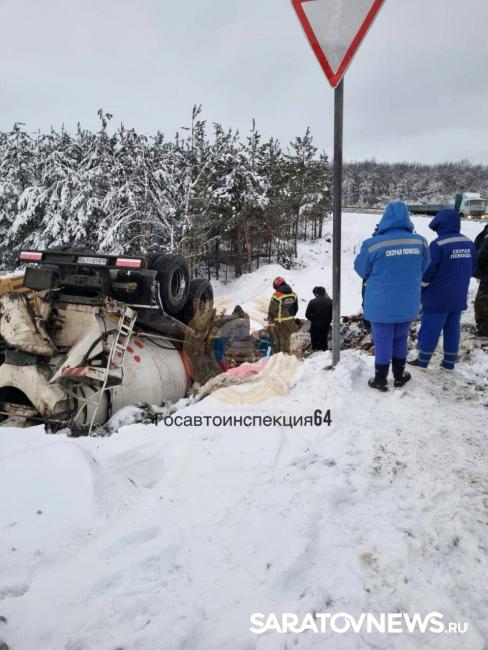 Примерно полтора часа назад в Гагаринском районе Саратова произошло ДТП. На дороге "Саратов - Песчаный Умет", у поселка Соколовый, съехала в кювет и перевернулась бетономешалка.