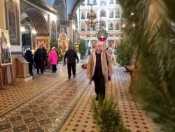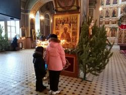 В храме идёт подготовка к рождественской службе. Пришли очень много семей с детьми.