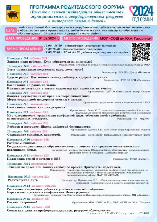 1 февраля 2024 года в МОУ «СОШ им.Ю.А. Гагарина» состоится муниципальный родительский форум «Вместе с семьей: интеграция общественных, муниципальных и государственных ресурсов в интересах семьи и детей».