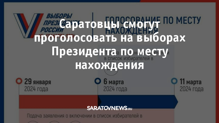 В Саратовской области начался прием заявлений для голосования по месту нахождения на выборах Президента России. Для этого нужно подать заявление в МФЦ, через Госуслуги или в любую территориальную избирательную комиссию в период с 29 января по 11 марта. С 6 по 11 марта заявления начнут принимать любые участковые избирательные комиссии. С собой нужно взять паспорт.