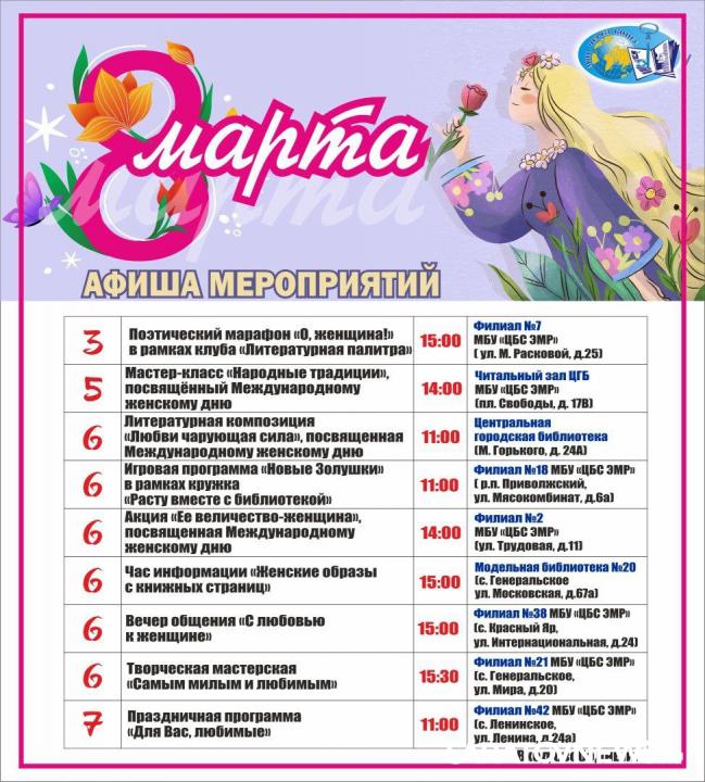 В преддверии Международного женского дня 8 марта в библиотеках Энгельсского муниципального района состоится ряд мероприятий. Об этом сообщает сайт районной администрации.