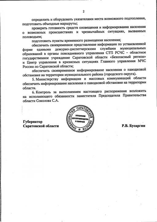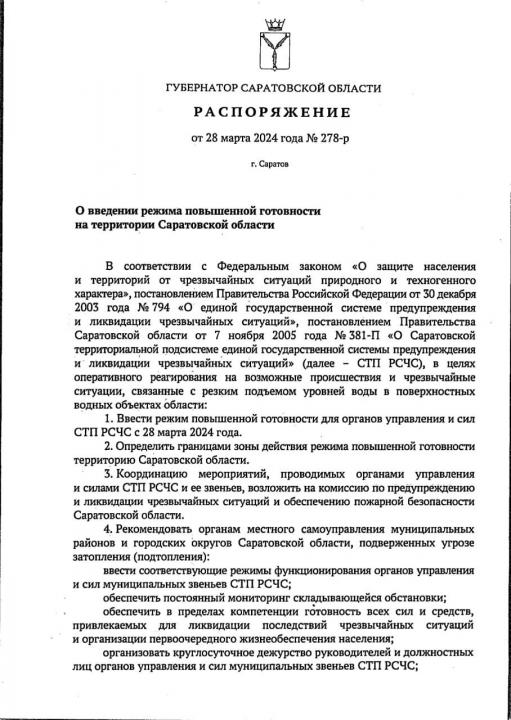 Сегодня, 28 марта, губернатор области Роман Бусаргин подписал распоряжение о введении с сегодняшнего дня на территории Саратовской области режима повышенной готовности в связи с весенним паводком.
