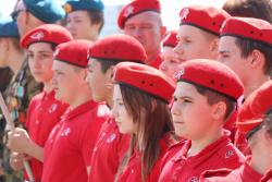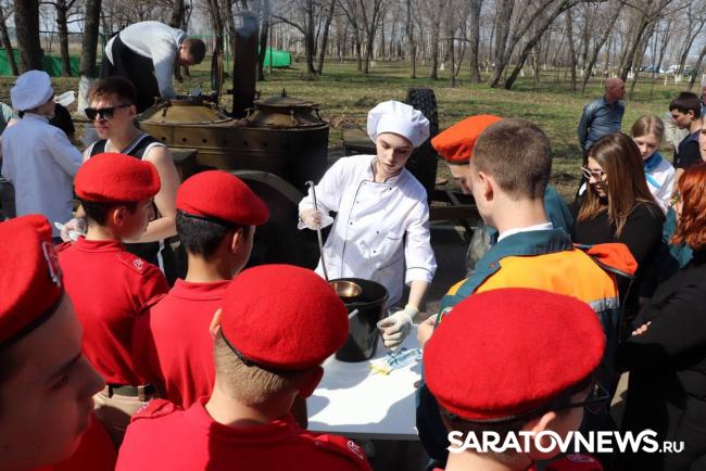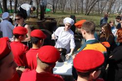 С большим интересом ребята посмотрели соревнования профессионалов парашютного спорта. А после попробовали настоящую фронтовую кашу.