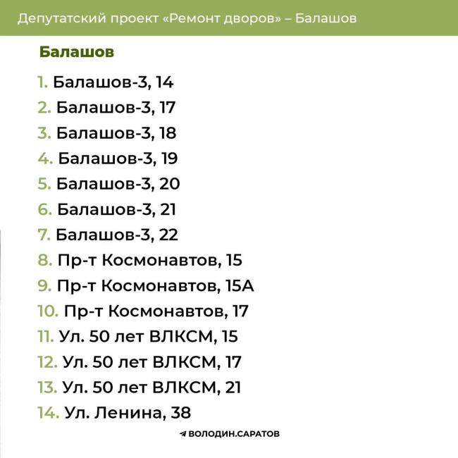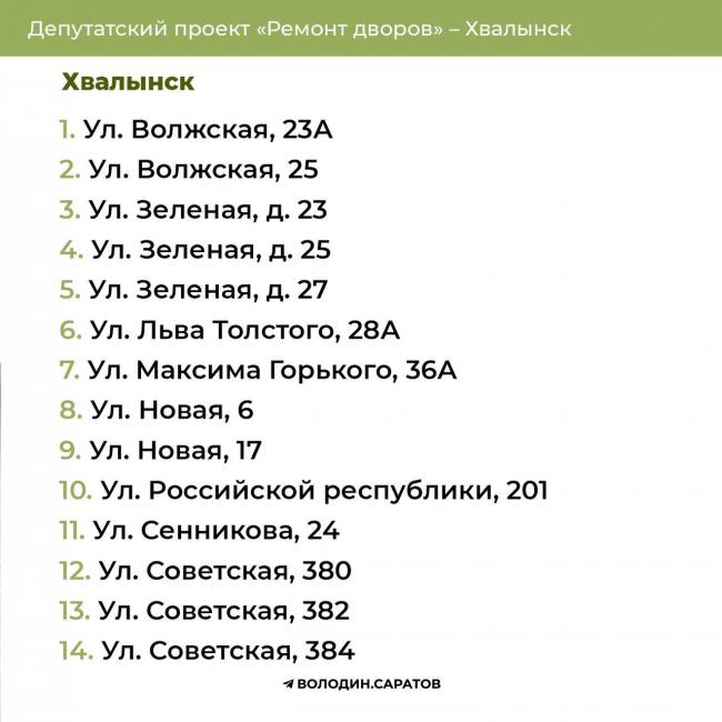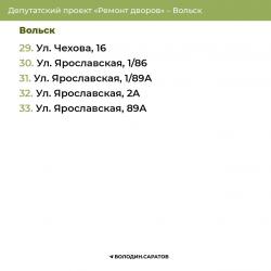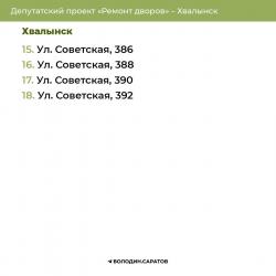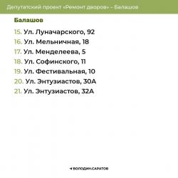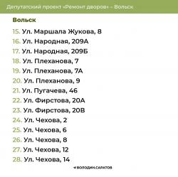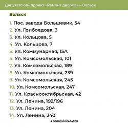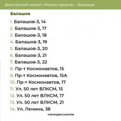 В Саратовской области реализуется трехлетний депутатский проект «Ремонт дворов». Сегодня мы публикуем списки адресов домов Балашова, Хвалынска и Вольска.