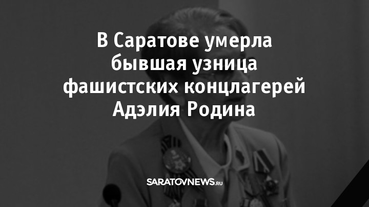 29 апреля в Саратове скончалась председатель Саратовского регионального отделения общероссийской общественной организации Российского Союза бывших малолетних узников фашистских концлагерей Адэлия Викторовна Родина. Об этом сообщает региональное министерство труда и социальной защиты.