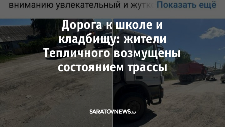Жители поселка Тепличный Гагаринского района возмущены состоянием местной автотрассы. Дорога ведет к кладбищу, но по ней также водят в школу детей. По словам «новых саратовцев», трасса представляет собой сплошные ухабы и ямы, ходить по которым опасно.